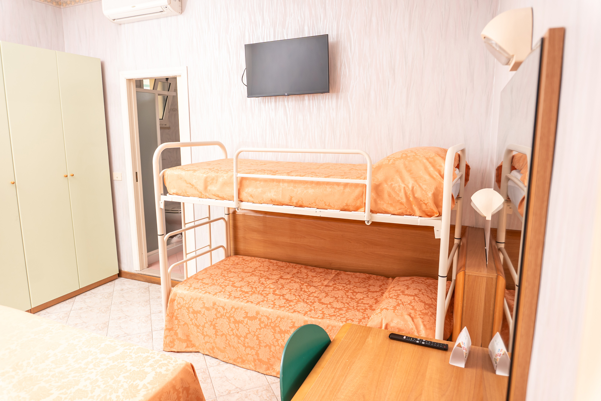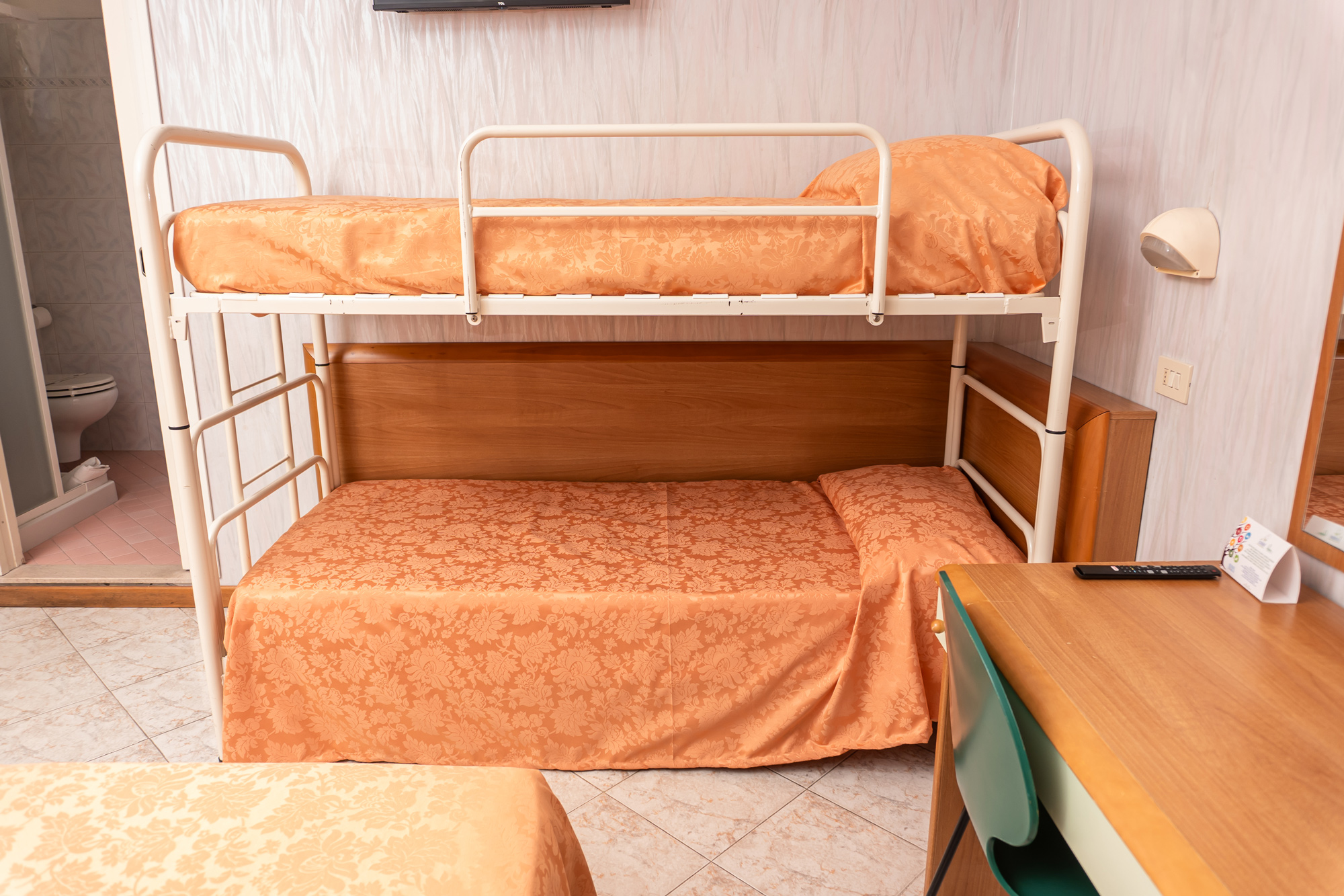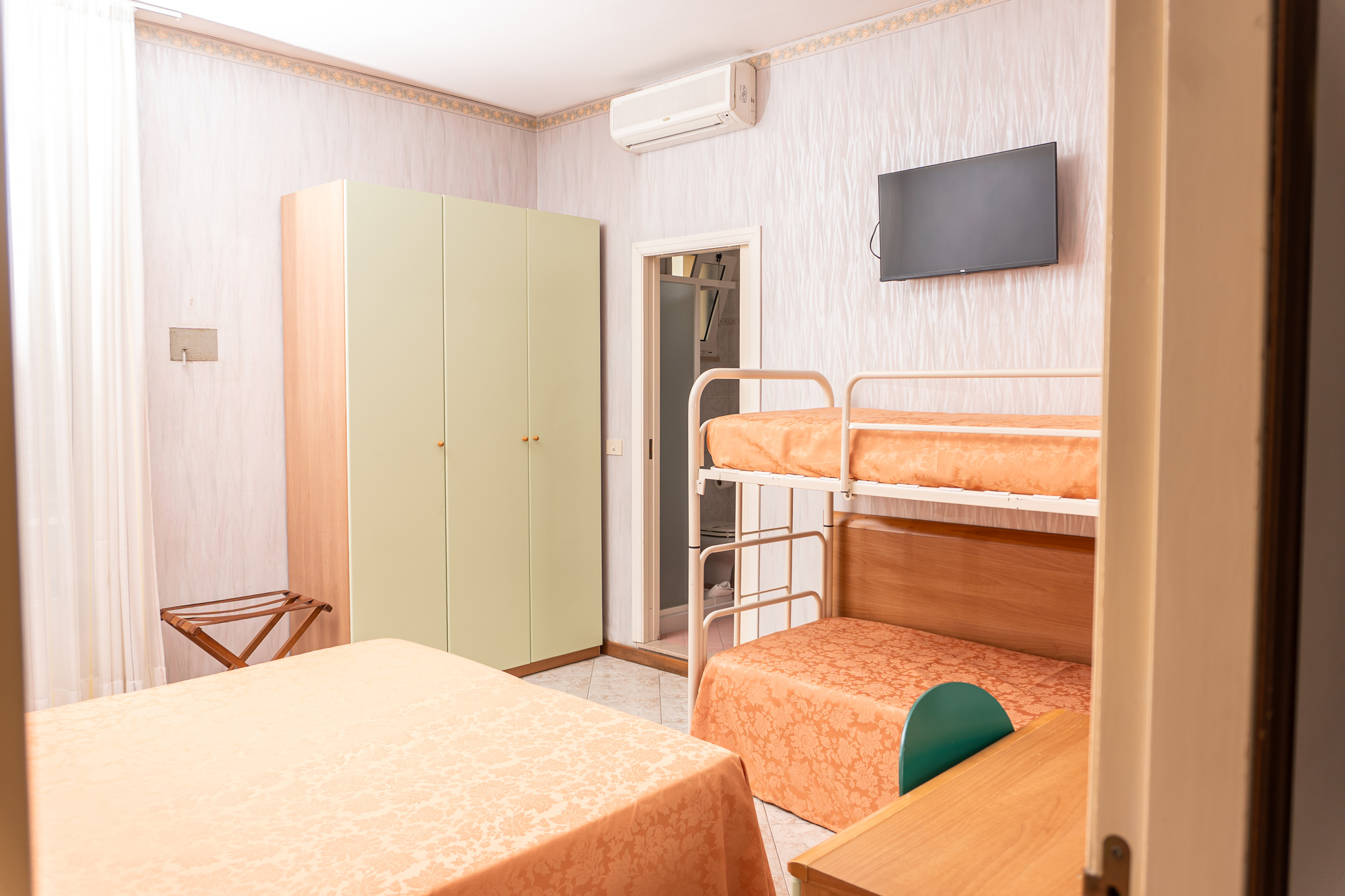 Si vous avez besoin de plus d'espace, choisissez l'une de nos Family Rooms à Riccione. Elles sont également équipées d'un balcon privé, peuvent accueillir jusqu'à 5 personnes et comprennent un lit double, un lit superposé et un lit simple ou un berceau. À l'intérieur, vous trouverez également des équipements destinés aux plus petits (barrières de lit et baignoire pour bébé) pour des vacances sûres et adaptées à chaque famille.